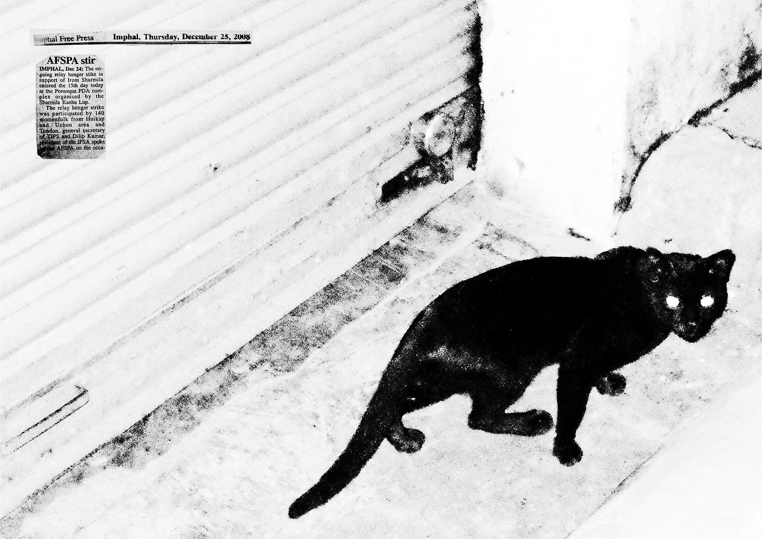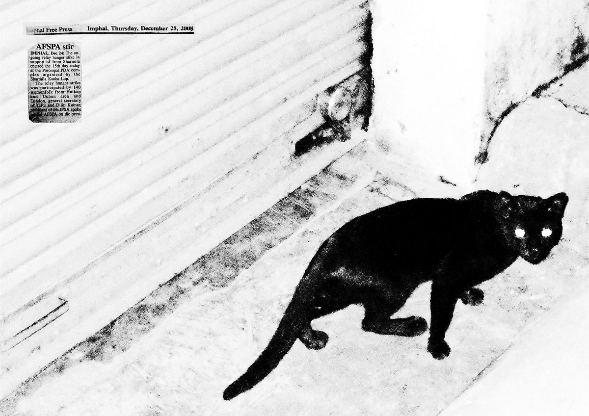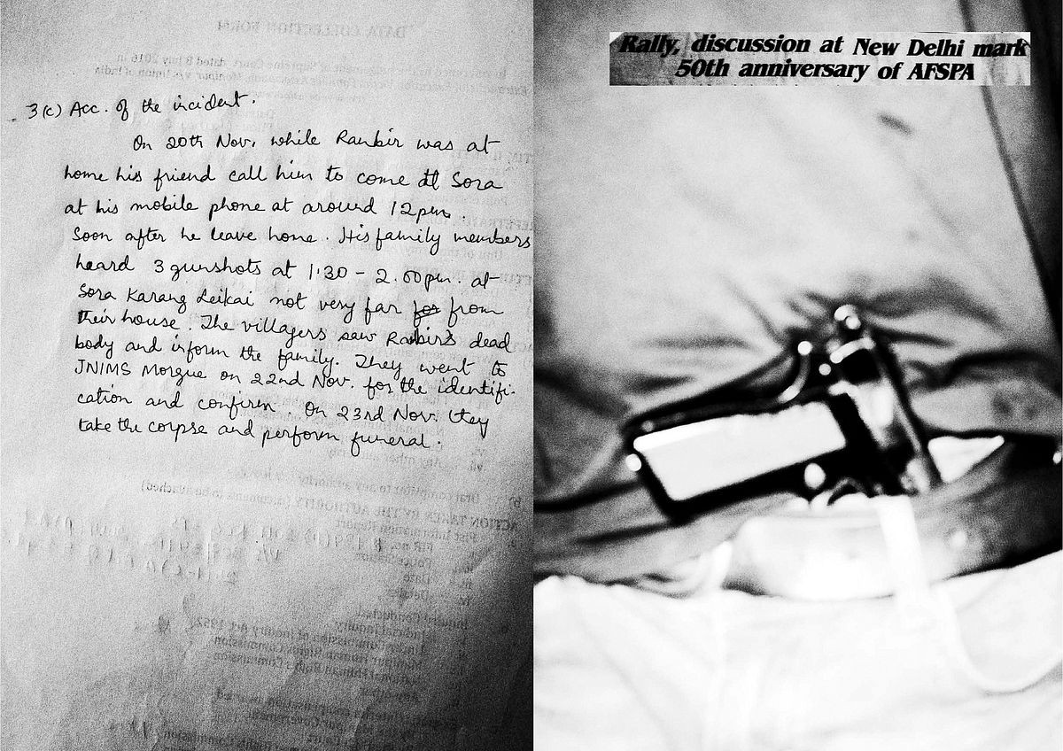 This organization formed by the mothers’ and the wives’ of the victims’ filed complaints against the Armed forces. In their office, I came across “A cupboard” which contained files documenting 1528 extrajudicial killings carried out by the Indian Armed Forces between 1979 - 2012 and this changed everything. My work shifted from just talking about Irom Sharmila to what are known as 'Fake Encounters' and the events of the past 33 years. My daily routine was to reach EEVFAM’s office at 9 am and go through the various data collection forms and piles of photocopied documents submitted by the victim's families. The text stating the last sightings was what stayed with me. I would also make notes of the places these abductions and killings would take place and in the evening I would ask my friends to take me to those places. It was like I was in a trance. I reacted to the surroundings and photographed it. The shock I received by not being aware of what is happening in my own country compelled me to make this book so that my audience might feel what I felt when I opened the cupboard and also my practice, which consisted of handling the various folders, newspapers and other documents.
